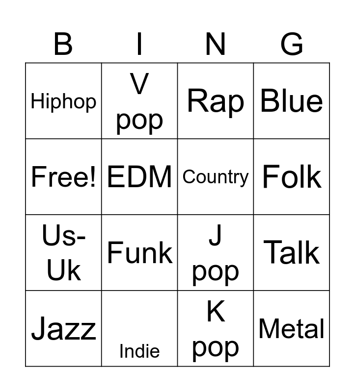 This bingo card has 16 words: Indie, Talk, Rap, Hiphop, Us-Uk, V pop, J pop, K pop, Free!, EDM, Jazz, Blue, Funk, Folk, Country and Metal.
