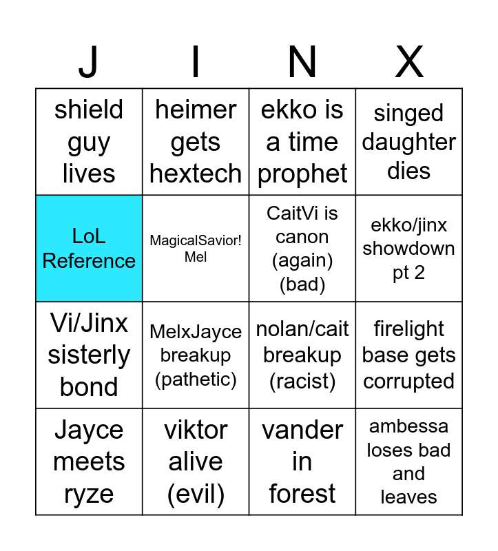 This bingo card has 16 words: viktor alive (evil), firelight base gets corrupted, ekko is a time prophet, shield guy lives, Vi/Jinx sisterly bond, heimer gets hextech, nolan/cait breakup (racist), vander in forest, LoL Reference, MagicalSavior! Mel, Jayce meets ryze, singed daughter dies, MelxJayce breakup (pathetic), ekko/jinx showdown pt 2, CaitVi is canon (again) (bad) and ambessa loses bad and leaves.