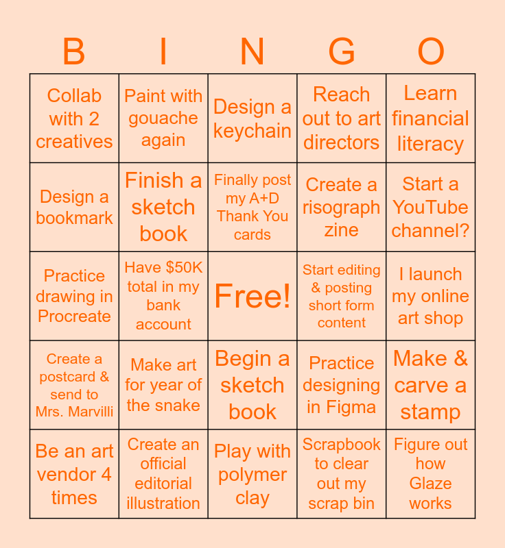This bingo card has a free space and 24 words: Make art for year of the snake, Create an official editorial illustration, Finally post my A+D Thank You cards, Be an art vendor 4 times, Learn financial literacy, Collab with 2 creatives, Design a bookmark, Paint with gouache again, Start editing & posting short form content, Begin a sketch book, Create a risograph zine, Practice drawing in Procreate, Practice designing in Figma, Make & carve a stamp, Finish a sketch book, Scrapbook to clear out my scrap bin, I launch my online art shop, Design a keychain, Start a YouTube channel?, Have $50K total in my bank account, Figure out how Glaze works, Create a postcard & send to Mrs. Marvilli, Reach out to art directors and Play with polymer clay.