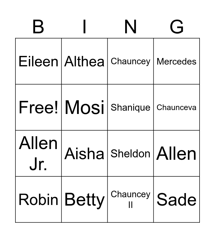 This bingo card has 16 words: Betty, Allen, Chauncey, Eileen, Allen Jr., Althea, Sheldon, Chauncey II, Free!, Mosi, Robin, Mercedes, Aisha, Chaunceva, Shanique and Sade.