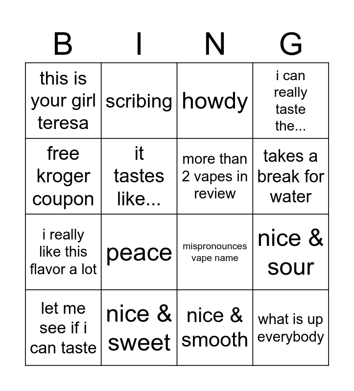 This bingo card has 16 words: nice & sweet, nice & sour, howdy, this is your girl teresa, i really like this flavor a lot, scribing, mispronounces vape name, nice & smooth, free kroger coupon, it tastes like..., let me see if i can taste, i can really taste the..., peace, takes a break for water, more than 2 vapes in review and what is up everybody.