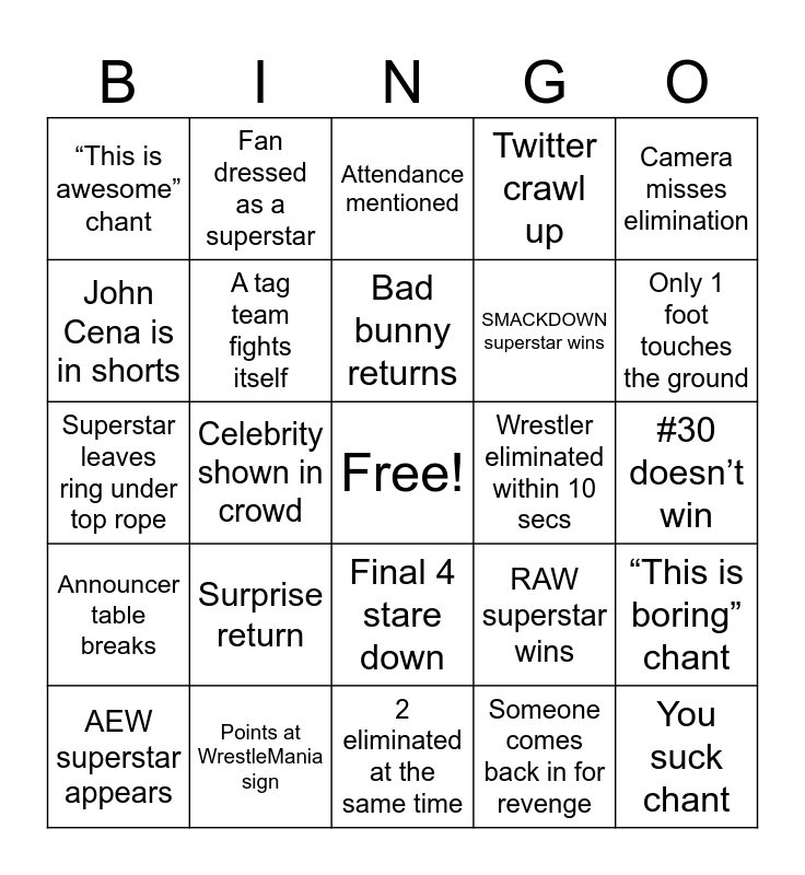 This bingo card has a free space and 24 words: Surprise return, Points at WrestleMania sign, Bad bunny returns, AEW superstar appears, Camera misses elimination, “This is awesome” chant, John Cena is in shorts, Fan dressed as a superstar, Wrestler eliminated within 10 secs, Final 4 stare down, SMACKDOWN superstar wins, Superstar leaves ring under top rope, RAW superstar wins, “This is boring” chant, A tag team fights itself, Someone comes back in for revenge, #30 doesn’t win, Attendance mentioned, Only 1 foot touches the ground, Celebrity shown in crowd, You suck chant, Announcer table breaks, Twitter crawl up and 2 eliminated at the same time.