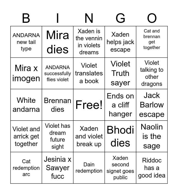 This bingo card has a free space and 24 words: Cat redemption arc, Violet has dream future sight, Violet translates a book, Xaden second signet goes public, Cat and brennan get together, ANDARNA new tail type, Mira dies, Xaden is the vennin in violets dreams, Ends on a cliff hanger, Jack Barlow escape, White andarna, ANDARNA successfully flies violet, Bhodi dies, Naolin is the sage, Mira x imogen, Jesinia x Sawyer fucc, Dain redemption, Xaden helps jack escape, Violet talking to other dragons, Violet and arrick get together, Brennan dies, Xaden and violet break up, Violet Truth sayer and Riddoc has a good idea.