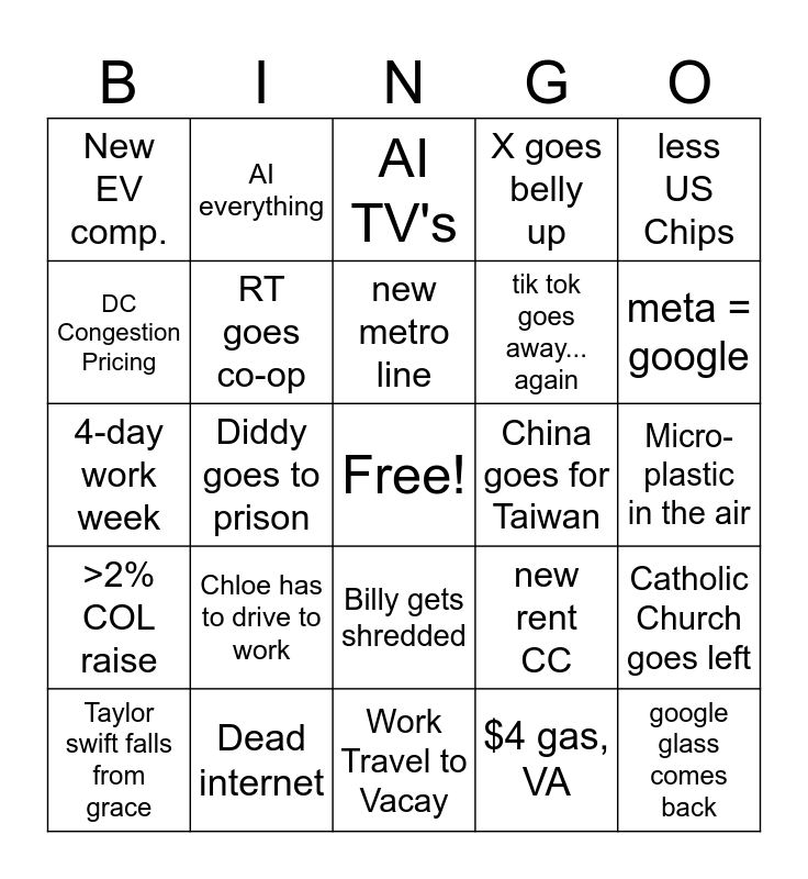 This bingo card has a free space and 24 words: Chloe has to drive to work, Dead internet, new metro line, Taylor swift falls from grace, less US Chips, New EV comp., DC Congestion Pricing, AI everything, China goes for Taiwan, Billy gets shredded, tik tok goes away... again, 4-day work week, new rent CC, Catholic Church goes left, RT goes co-op, $4 gas, VA, Micro-plastic in the air, AI TV's, meta = google, Diddy goes to prison, google glass comes back, >2% COL raise, X goes belly up and Work Travel to Vacay.