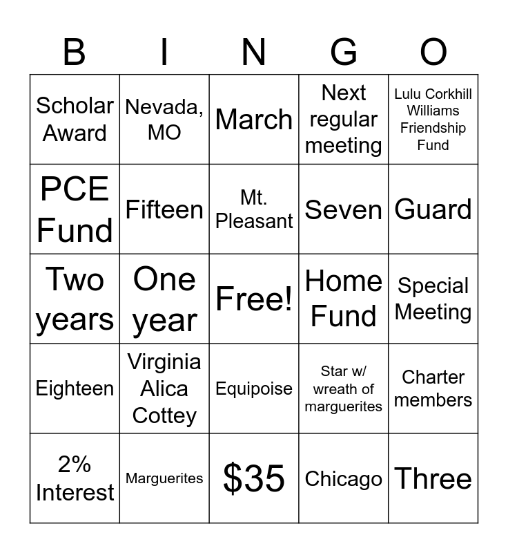 This bingo card has a free space and 24 words: Virginia Alica Cottey, Marguerites, Mt. Pleasant, 2% Interest, Lulu Corkhill Williams Friendship Fund, Scholar Award, PCE Fund, Nevada, MO, Home Fund, Equipoise, Seven, Two years, Star w/ wreath of marguerites, Charter members, Fifteen, Chicago, Special Meeting, March, Guard, One year, Three, Eighteen, Next regular meeting and $35.