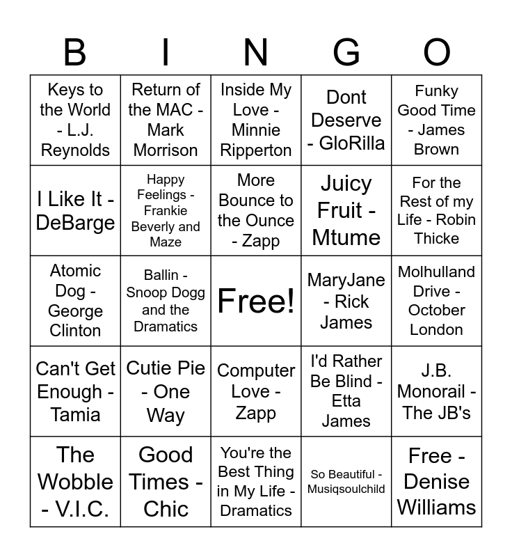 This bingo card has a free space and 24 words: Cutie Pie - One Way, Good Times - Chic, More Bounce to the Ounce - Zapp, The Wobble - V.I.C., Funky Good Time - James Brown, Keys to the World - L.J. Reynolds, I Like It - DeBarge, Return of the MAC - Mark Morrison, MaryJane - Rick James, Computer Love - Zapp, Juicy Fruit - Mtume, Atomic Dog - George Clinton, I'd Rather Be Blind - Etta James, J.B. Monorail - The JB's, Happy Feelings - Frankie Beverly and Maze, So Beautiful - Musiqsoulchild, Molhulland Drive - October London, Inside My Love - Minnie Ripperton, For the Rest of my Life - Robin Thicke, Ballin - Snoop Dogg and the Dramatics, Free - Denise Williams, Can't Get Enough - Tamia, Dont Deserve - GloRilla and You're the Best Thing in My Life - Dramatics.