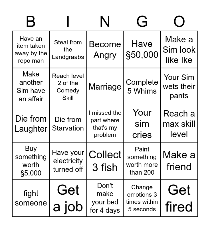 This bingo card has a free space and 24 words: Have your electricity turned off, Get a job, Marriage, fight someone, Make a Sim look like Ike, Have an item taken away by the repo man, Make another Sim have an affair, Steal from the Landgraabs, Your sim cries, Collect 3 fish, Complete 5 Whims, Die from Laughter, Paint something worth more than 200, Make a friend, Reach level 2 of the Comedy Skill, Change emotions 3 times within 5 seconds, Reach a max skill level, Become Angry, Your Sim wets their pants, Die from Starvation, Get fired, Buy something worth §5,000, Have §50,000 and Don't make your bed for 4 days.
