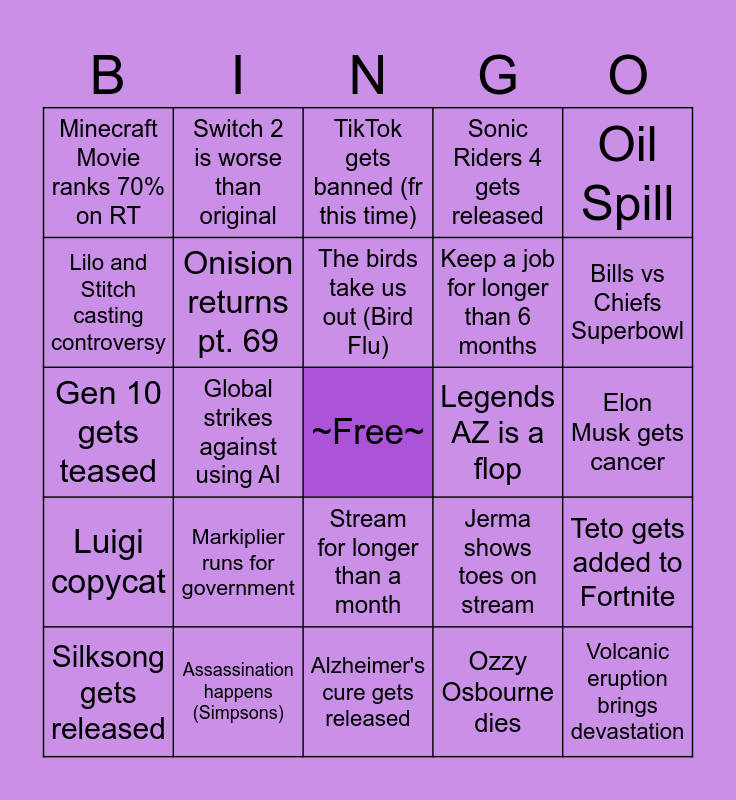 This bingo card has a free space and 24 words: Markiplier runs for government, Assassination happens (Simpsons), The birds take us out (Bird Flu), Silksong gets released, Oil Spill, Minecraft Movie ranks 70% on RT, Lilo and Stitch casting controversy, Switch 2 is worse than original, Legends AZ is a flop, Stream for longer than a month, Keep a job for longer than 6 months, Gen 10 gets teased, Jerma shows toes on stream, Teto gets added to Fortnite, Onision returns pt. 69, Ozzy Osbourne dies, Elon Musk gets cancer, TikTok gets banned (fr this time), Bills vs Chiefs Superbowl, Global strikes against using AI, Volcanic eruption brings devastation, Luigi copycat, Sonic Riders 4 gets released and Alzheimer's cure gets released.