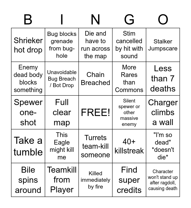 This bingo card has a free space and 24 words: This Eagle might kill me, Teamkill from Player, Chain Breached, Bile spins around, Stalker Jumpscare, Shrieker hot drop, Enemy dead body blocks something, Bug blocks grenade from bug-hole, Silent spewer or other massive enemy, Turrets team-kill someone, More Rares than Commons, Spewer one-shot, 40+ killstreak, "I'm so dead" *doesn't die*, Unavoidable Bug Breach / Bot Drop, Find super credits, Charger climbs a wall, Die and have to run across the map, Less than 7 deaths, Full clear map, Character won't stand up after ragdoll, causing death, Take a tumble, Stim cancelled by hit with sound and Killed immediately by fire.