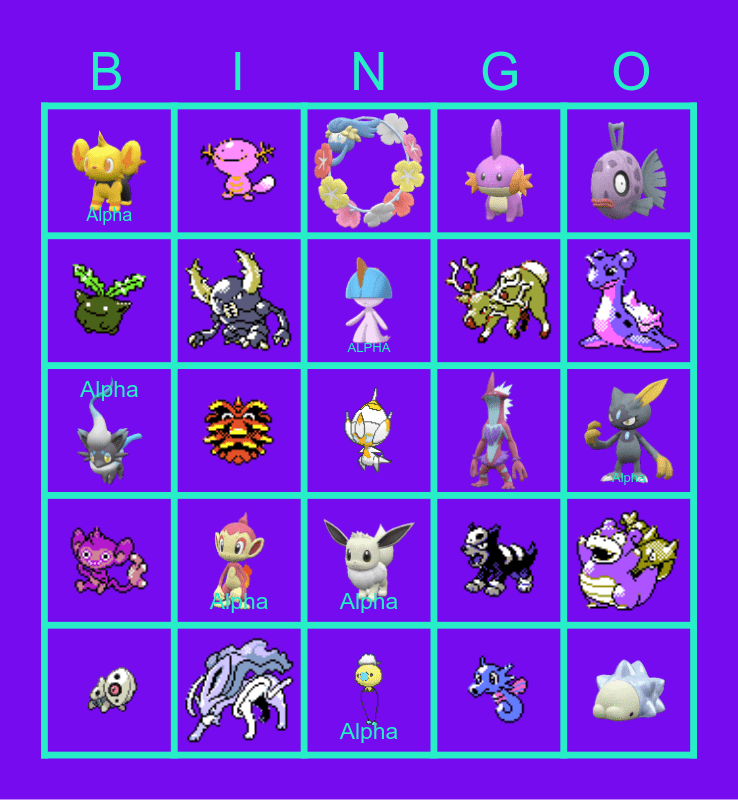 This bingo card has 25 images and 7 words: Alpha, Alpha, ALPHA, Alpha, Alpha, Alpha and Alpha.