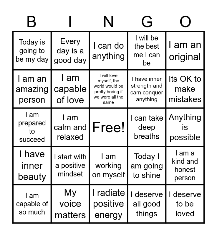 This bingo card has a free space and 29 words: I am capable of so much, I am enough, I am calm and relaxed, I am building my future, Today is going to be my day, I can do anything, I am capable of love, I start with a positive mindset, I can take deep breaths, My voice matters, Anything is possible, I deserve to be loved, I radiate positive energy, I deserve all good things, Its OK to make mistakes, I am making the right choice, I am working on myself, I have inner beauty, I am an original, I am prepared to succeed, Today I am going to shine, My mistakes help me learn, I have inner strength and cam conquer anything, I am an amazing person, I will be the best me I can be, Every day is a good day, I am a kind and honest person, I will love myself, the world would be pretty boring if we were all the same and I will do (good) things that make me happy.