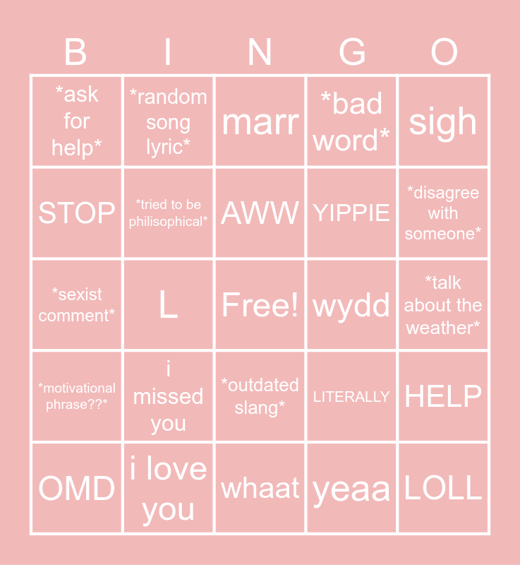 This bingo card has a free space and 24 words: i missed you, i love you, AWW, OMD, sigh, *ask for help*, STOP, *random song lyric*, wydd, *outdated slang*, YIPPIE, *sexist comment*, LITERALLY, HELP, *tried to be philisophical*, yeaa, *talk about the weather*, marr, *disagree with someone*, L, LOLL, *motivational phrase??*, *bad word* and whaat.