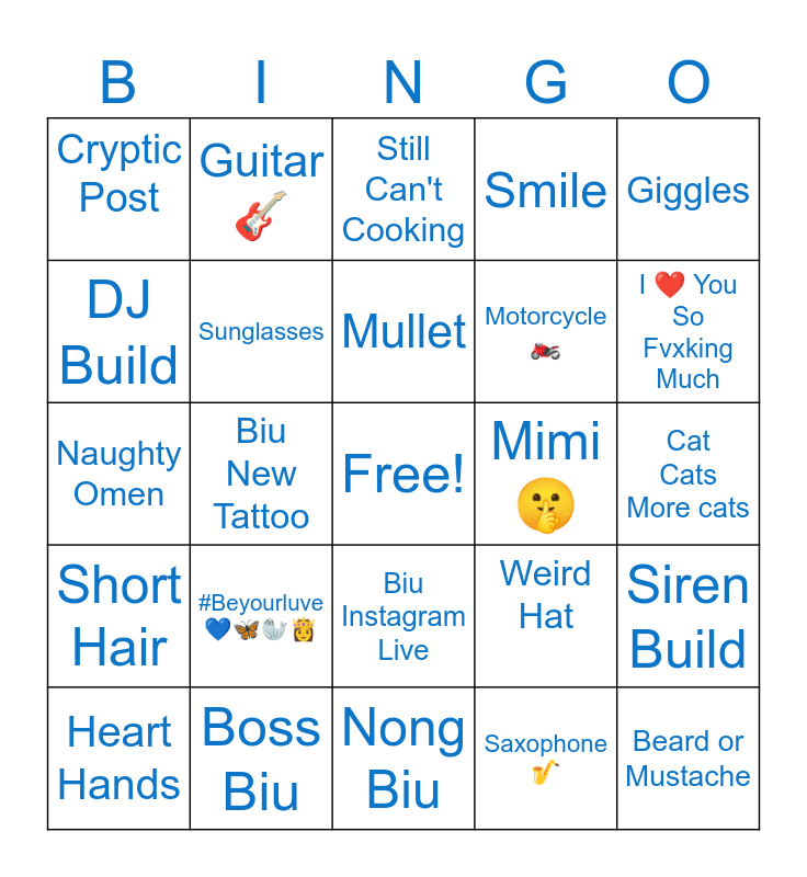This bingo card has a free space and 29 words: P'Jak, Boss Biu, Still Can't Cooking, Long Hair, Giggles, Cryptic Post, Sunglasses, Mullet, Mimi 🤫, Siren Build, Heart Hands, Biu New Tattoo, Saxophone 🎷, Beard or Mustache, Naughty Omen, Dimples, Nong Biu, Weird Hat, I ❤️ You So Fvxking Much, Short Hair, #Beyourluve 💙🦋🦭👸, Biu with Wave or Jern, Motorcycle 🏍, Cat Cats More cats, DJ Build, Guitar 🎸, Biu Instagram Live, Smile and Dance Dance.