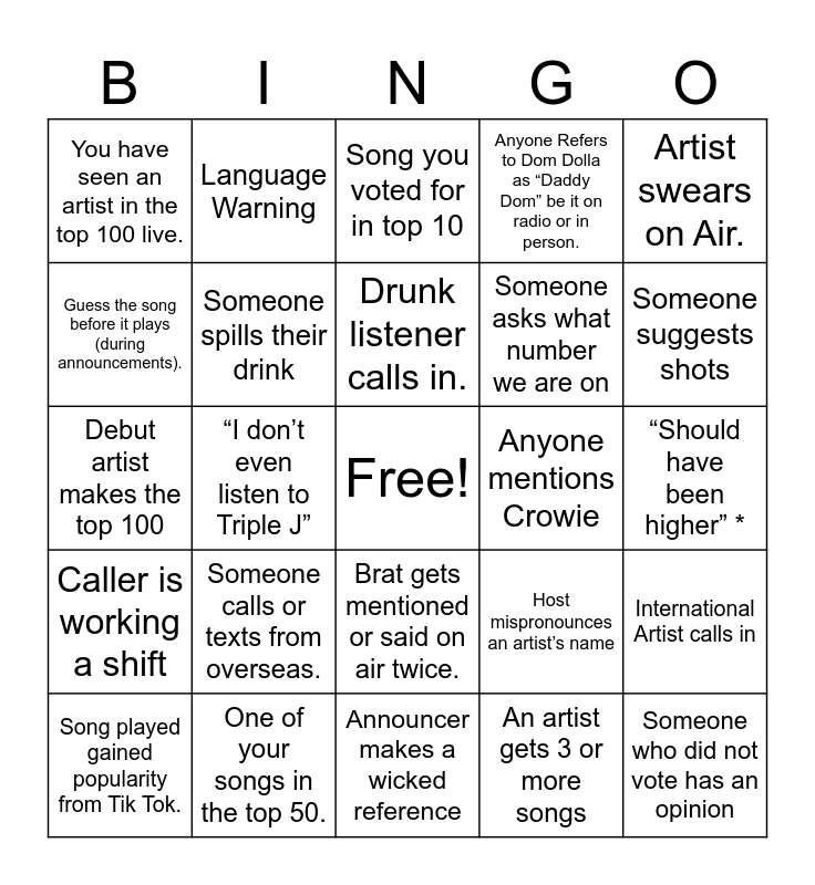 This bingo card has a free space and 24 words: Someone calls or texts from overseas., One of your songs in the top 50., Drunk listener calls in., Song played gained popularity from Tik Tok., Artist swears on Air., You have seen an artist in the top 100 live., Guess the song before it plays (during announcements)., Language Warning, Anyone mentions Crowie, Brat gets mentioned or said on air twice., Someone asks what number we are on, Debut artist makes the top 100, Host mispronounces an artist’s name, International Artist calls in, Someone spills their drink, An artist gets 3 or more songs, “Should have been higher” *, Song you voted for in top 10, Someone suggests shots, “I don’t even listen to Triple J”, Someone who did not vote has an opinion, Caller is working a shift, Anyone Refers to Dom Dolla as “Daddy Dom” be it on radio or in person. and Announcer makes a wicked reference.