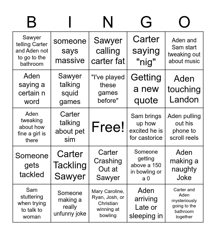 This bingo card has a free space and 24 words: Carter Tackling Sawyer, Someone making a really unfunny joke, "I've played these games before", Sam stuttering when trying to talk to woman, Aden and Sam start tweaking out about music, Sawyer telling Carter and Aden not to go to the bathroom, Aden saying a certain n word, someone says massive, Sam brings up how excited he is for castorice, Carter Crashing Out at Sawyer, Getting a new quote, Aden tweaking about how fine a girl is there, Someone getting above a 150 in bowling or a 0, Aden making a naughty Joke, Sawyer talking squid games, Aden arriving Late or sleeping in, Aden pulling out his phone to scroll reels, Sawyer calling carter fat, Aden touching Landon, Carter talking about pet sim, Carter and Aden mysteriously going to the bathroom together, Someone gets tackled, Carter saying "nig" and Mary Caroline, Ryan, Josh, or Christian winning at bowling.