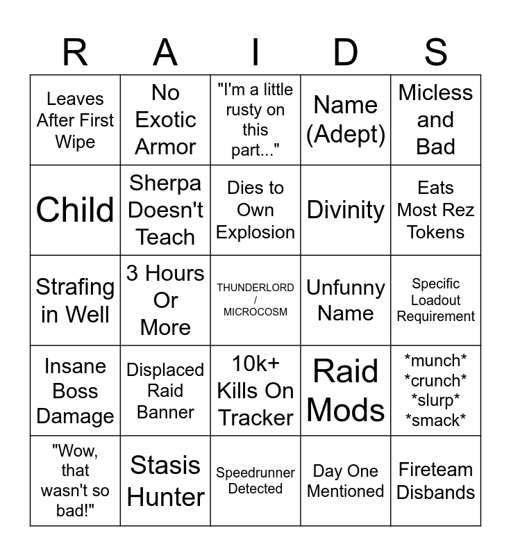This bingo card has a free space and 78 words: Double Primary, Silent Leaver, "I'm a little rusty on this part...", Joins KWTD, Doesn't KWTD, Over-Enthusiastic Sherpa, "There goes flawless!!!!", ENRAGE IS NEAR, Targeting Adjuster, Intoxicated Guardian, Multiple Raid Banners, Yapping, "I'll do ad clear.", Name (Adept), Leaves After First Wipe, D1 Mentioned, Child, No Noise Cancellation On Mic, Displaced Raid Banner, IRL Lore Dumping, Specific Loadout Requirement, Loot Complaints, Micless and Bad, Strafing in Well, Dies to Own Explosion, Sherpa Doesn't Teach, No Warlocks, Damage Lower Than Debuffer, Leader Doesn't KWTD (needs teaching excl.), "Why did we wipe?", Meme Weapon Glazing, Eats Most Rez Tokens, Directionally Challenged, Speedrunner Detected, No Orbs/Ammo Scout, "Wow, that wasn't so bad!", Unfunny Name, Glaive, Raid Exotic Drop, 8x+ Gilded Title, Fireteam Disbands, Roaming Super On Boss, Error Code, Does Cheese, Emergency Reinforcement, PvP Roll, No Exotic Armor, Off-Meta Crafted Roll, Failed Skate, Guardian Rank Mentioned, Bad Callout, *munch* *crunch* *slurp* *smack*, 3 Hours Or More, Raid Mods, Dawning Weapon, Abandons Role, Gambit Mentioned, Raid Banner Placed Early, Steals Checkpoint, Leaves, Trials Armor, 10k+ Kills On Tracker, Divinity, Random Shaders On Armor, Eververse Whale, Lumina, Anti-Barrier Exotic, Starfire Protocol, Trace Rifle, D2 Y1 DPS, Insane Boss Damage, Stasis Hunter, Banner of War, PvP Exotic Armor, Dredgen, "I have x clears...", Day One Mentioned, Surge Mods Don't Match, Meme Title and "Better" Strat Suggested.