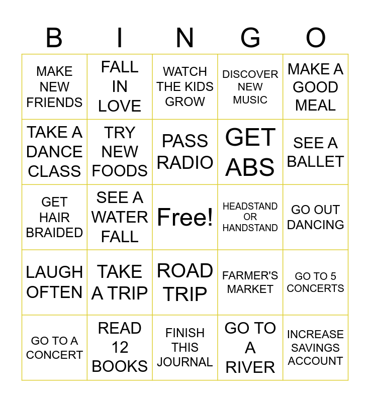 This bingo card has a free space and 24 words: TAKE A TRIP, READ 12 BOOKS, PASS RADIO, GO TO A CONCERT, MAKE A GOOD MEAL, MAKE NEW FRIENDS, TAKE A DANCE CLASS, FALL IN LOVE, HEADSTAND OR HANDSTAND, ROAD TRIP, GET ABS, GET HAIR BRAIDED, FARMER'S MARKET, GO TO 5 CONCERTS, TRY NEW FOODS, GO TO A RIVER, GO OUT DANCING, WATCH THE KIDS GROW, SEE A BALLET, SEE A WATER FALL, INCREASE SAVINGS ACCOUNT, LAUGH OFTEN, DISCOVER NEW MUSIC and FINISH THIS JOURNAL.