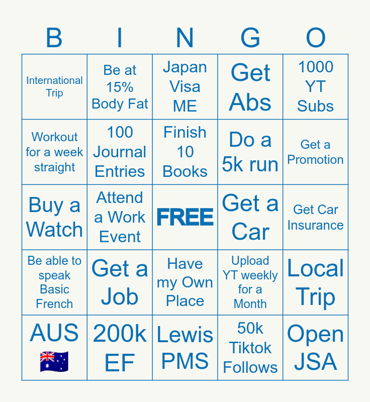 This bingo card has a free space and 24 words: Get a Job, 200k EF, Finish 10 Books, AUS🇦🇺, 1000 YT Subs, International Trip, Workout for a week straight, Be at 15% Body Fat, Get a Car, Have my Own Place, Do a 5k run, Buy a Watch, Upload YT weekly for a Month, Local Trip, 100 Journal Entries, 50k Tiktok Follows, Get Car Insurance, Japan Visa ME, Get a Promotion, Attend a Work Event, Open JSA, Be able to speak Basic French, Get Abs and Lewis PMS.