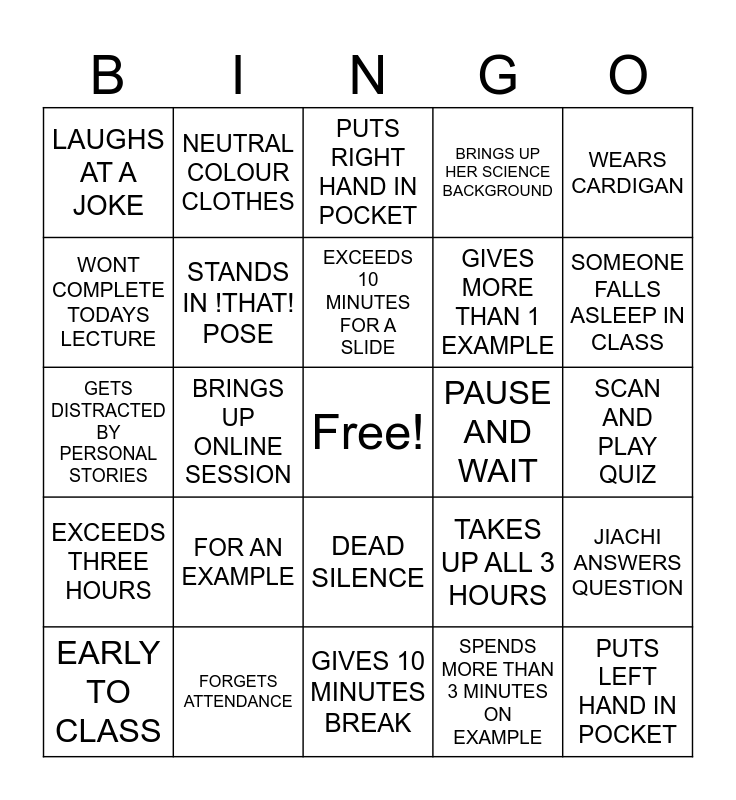 This bingo card has a free space and 24 words: FOR AN EXAMPLE, FORGETS ATTENDANCE, EXCEEDS 10 MINUTES FOR A SLIDE, EARLY TO CLASS, WEARS CARDIGAN, LAUGHS AT A JOKE, WONT COMPLETE TODAYS LECTURE, NEUTRAL COLOUR CLOTHES, PAUSE AND WAIT, DEAD SILENCE, GIVES MORE THAN 1 EXAMPLE, GETS DISTRACTED BY PERSONAL STORIES, TAKES UP ALL 3 HOURS, JIACHI ANSWERS QUESTION, STANDS IN !THAT! POSE, SPENDS MORE THAN 3 MINUTES ON EXAMPLE, SCAN AND PLAY QUIZ, PUTS RIGHT HAND IN POCKET, SOMEONE FALLS ASLEEP IN CLASS, BRINGS UP ONLINE SESSION, PUTS LEFT HAND IN POCKET, EXCEEDS THREE HOURS, BRINGS UP HER SCIENCE BACKGROUND and GIVES 10 MINUTES BREAK.