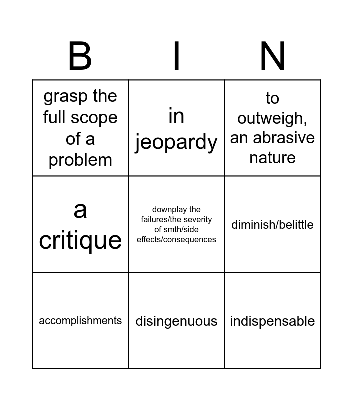 This bingo card has 12 words: to ruffle (someone's) feathers, indispensable, downplay the failures/the severity of smth/side effects/consequences, diminish/belittle, in jeopardy, to outweigh, an abrasive nature, disingenuous, go swimmingly, grasp the full scope of a problem, a critique, accomplishments and stem from.