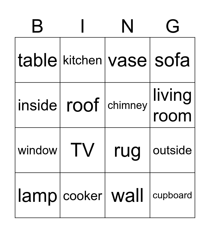 This bingo card has 18 words: TV, cupboard, vase, table, rug, sofa, lamp, kitchen, living room, window, wall, inside, outside, roof, chimney, kettle, cooker and fridge.