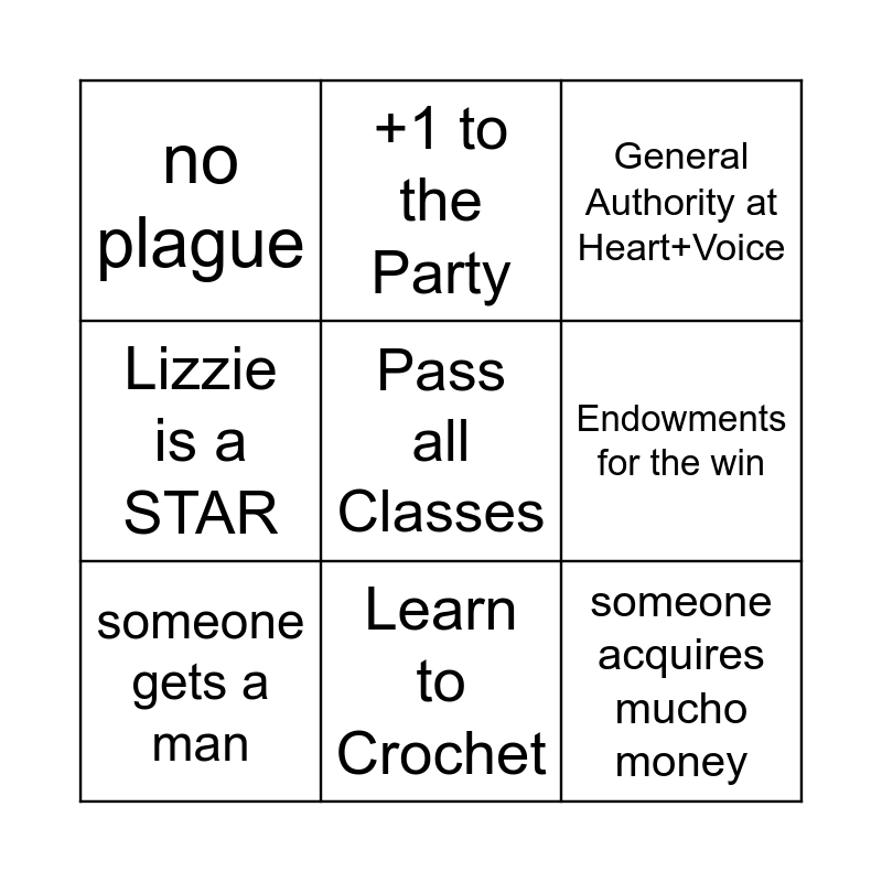 This bingo card has a free space and 8 words: Endowments for the win, General Authority at Heart+Voice, +1 to the Party, someone gets a man, no plague, someone acquires mucho money, Lizzie is a STAR and Learn to Crochet.