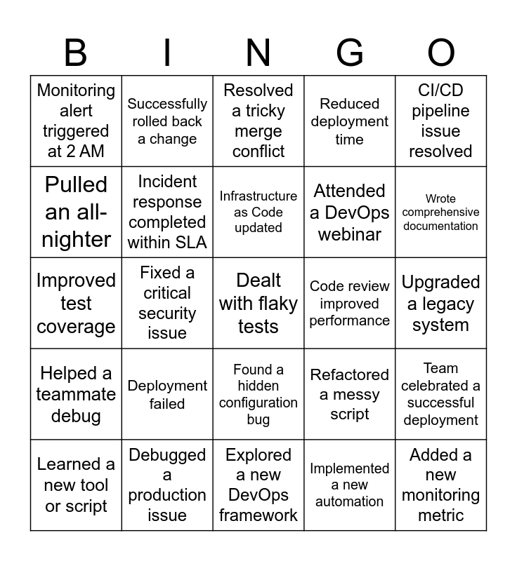This bingo card has a free space and 24 words: Deployment failed, Debugged a production issue, Infrastructure as Code updated, Learned a new tool or script, CI/CD pipeline issue resolved, Monitoring alert triggered at 2 AM, Pulled an all-nighter, Successfully rolled back a change, Code review improved performance, Found a hidden configuration bug, Attended a DevOps webinar, Improved test coverage, Refactored a messy script, Team celebrated a successful deployment, Incident response completed within SLA, Implemented a new automation, Upgraded a legacy system, Resolved a tricky merge conflict, Wrote comprehensive documentation, Fixed a critical security issue, Added a new monitoring metric, Helped a teammate debug, Reduced deployment time and Explored a new DevOps framework.