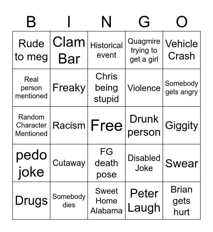 This bingo card has a free space and 24 words: Cutaway, Somebody dies, Chris being stupid, Drugs, Vehicle Crash, Rude to meg, Real person mentioned, Clam Bar, Drunk person, FG death pose, Violence, Random Character Mentioned, Disabled Joke, Swear, Freaky, Peter Laugh, Giggity, Historical event, Somebody gets angry, Racism, Brian gets hurt, pedo joke, Quagmire trying to get a girl and Sweet Home Alabama.
