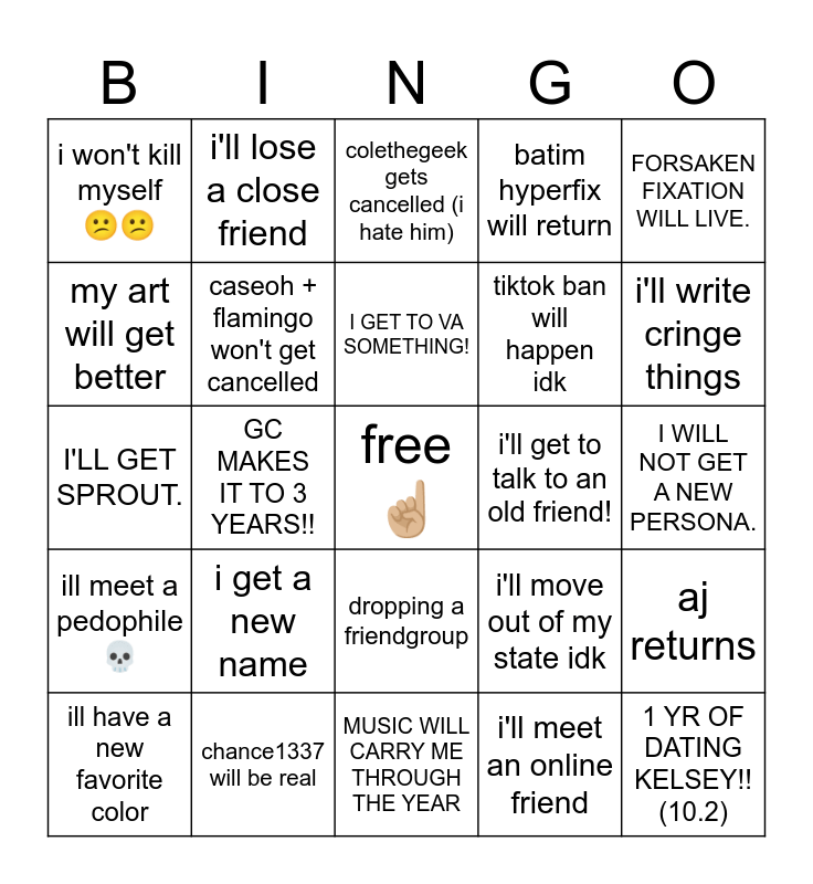 This bingo card has a free space and 24 words: i get a new name, chance1337 will be real, I GET TO VA SOMETHING!, ill have a new favorite color, FORSAKEN FIXATION WILL LIVE., i won't kill myself ππ, my art will get better, i'll lose a close friend, i'll get to talk to an old friend!, dropping a friendgroup, tiktok ban will happen idk, I'LL GET SPROUT., i'll move out of my state idk, aj returns, caseoh + flamingo won't get cancelled, i'll meet an online friend, I WILL NOT GET A NEW PERSONA., colethegeek gets cancelled (i hate him), i'll write cringe things, GC MAKES IT TO 3 YEARS!!, 1 YR OF DATING KELSEY!! (10.2), ill meet a pedophile π, batim hyperfix will return and MUSIC WILL CARRY ME THROUGH THE YEAR.