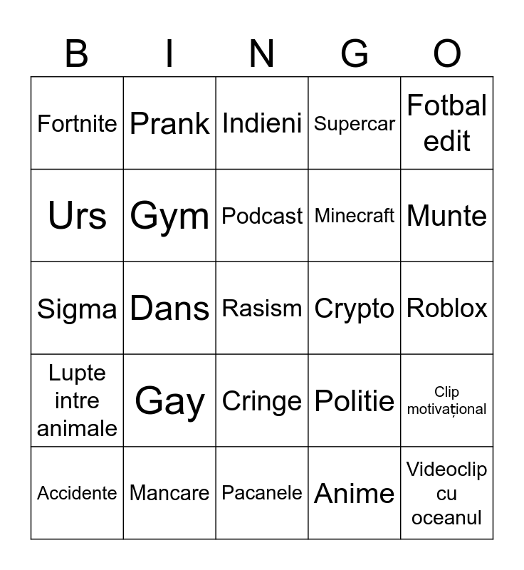 This bingo card has a free space and 24 words: Accidente, Gay, Podcast, Anime, Fotbal edit, Fortnite, Prank, Indieni, Crypto, Roblox, Sigma, Gym, Politie, Clip motivațional, Urs, Mancare, Pacanele, Supercar, Munte, Lupte intre animale, Dans, Cringe, Minecraft and Videoclip cu oceanul.