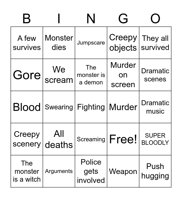 This bingo card has 25 words: All deaths, Police gets involved, The monster is a demon, The monster is a witch, They all survived, A few survives, Gore, Monster dies, Murder, Screaming, Murder on screen, Blood, Free!, SUPER BLOODLY, We scream, Push hugging, Dramatic music, Jumpscare, Dramatic scenes, Swearing, Fighting, Arguments, Creepy scenery, Creepy objects and Weapon.