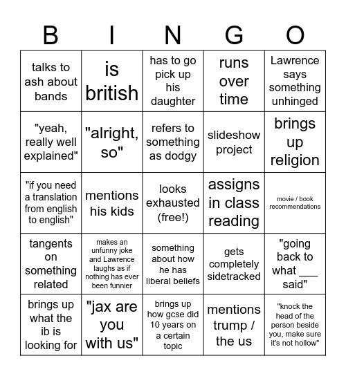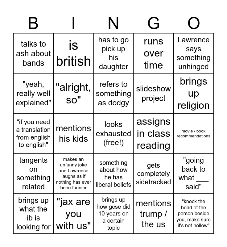 This bingo card has a free space and 28 words: "going back to what ___ said", "i don't usually give much homework", slideshow project, mentions trump / the us, "yeah, really well explained", has to go pick up his daughter, is british, tangents on something related, assigns in class reading, brings up what the ib is looking for, "if you need a translation from english to english", runs over time, "jax are you with us", brings up how gcse did 10 years on a certain topic, brings up religion, white shirt beige pant, makes an unfunny joke and Lawrence laughs as if nothing has ever been funnier, "alright, so", refers to something as dodgy, something about how he has liberal beliefs, talks to ash about bands, football mention, "knock the head of the person beside you, make sure it's not hollow", mentions his kids, movie / book recommendations, gets completely sidetracked, Lawrence says something unhinged and lore drop.
