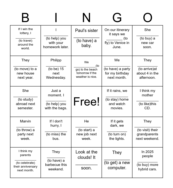 This bingo card has a free space and 24 words: If I don't hurry, I ___________ (to miss) the bus., They _________ (to have) a barbecue this weekend., We _____________(to go) to the beach tomorrow if the weather is nice., I think my parents ____________ (to celebrate) their anniversary next month., She ___________ (to buy) a new car soon., If I win the lottery, I ___________ (to travel) around the world., They ____________ (to move) to a new house next year., I ____________ (to help) you with your homework later., If it rains, we ___________ (to stay) home and watch movies., He ___________ (to start) a new job next week., We _____________ (to have) a party for my birthday next month., She ____________ (to study) abroad next semester., If it gets dark, we __________ (to turn on) the lights., They _____________ (to visit) their grandparents next weekend., Philipp __________ (to be) 15 next Wednesday., They ___________ (to get) a new computer., I think my mother ___________ (to like)this CD., Paul's sister ___________ (to have) a baby., They __________ (to arrive)at about 4 in the afternoon., Just a moment. I __________ (to help) you with the bags., In 2025 people __________ (to buy) more hybrid cars., Marvin _________ (to throw) a party next week., On our itinerary it says we ________ (to fly) to Venice in June. and Look at the clouds! It _________ soon..