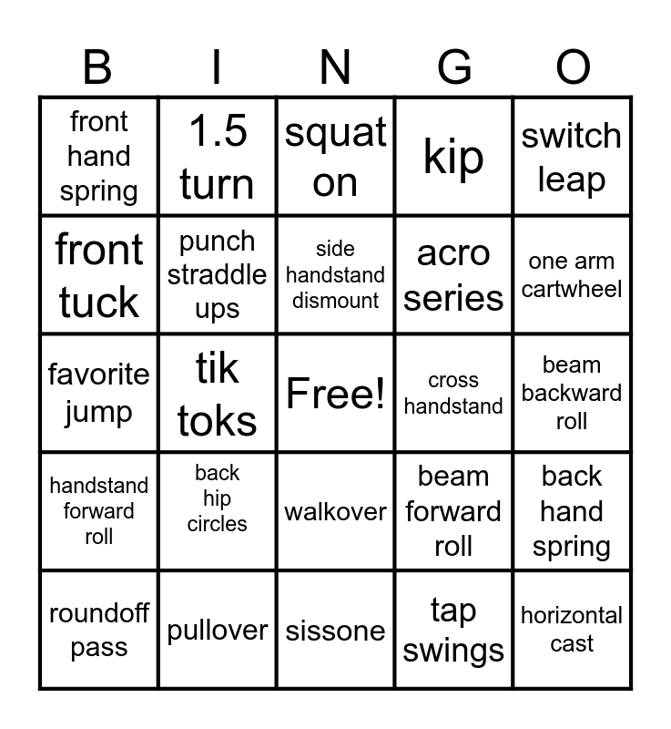 This bingo card has a free space and 24 words: back hip circles, pullover, side handstand dismount, roundoff pass, switch leap, front hand spring, front tuck, 1.5 turn, cross handstand, walkover, acro series, favorite jump, beam forward roll, back hand spring, punch straddle ups, tap swings, beam backward roll, squat on, one arm cartwheel, tik toks, horizontal cast, handstand forward roll, kip and sissone.