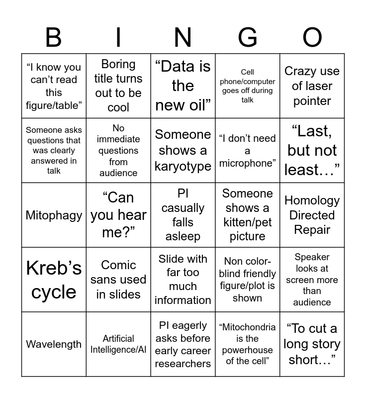 This bingo card has 50 words: Free!, PI casually falls asleep, Cool title turns out to be boring, PI eagerly asks before early career researchers, Comic sans used in slides, Technical difficulties, Boring title turns out to be cool, Question unrelated to the presentation, Someone asks questions that was clearly answered in talk, Blatant typo in slide, No immediate questions from audience, Cell phone/computer goes off during talk, Speaker looks at screen more than audience, Non color-blind friendly figure/plot is shown, Someone shows an UMAP plot, Someone shows a genetic pedigree, Someone shows a karyotype, Someone shows a kitten/pet picture, Speaker goes over time, Crazy use of laser pointer, “Can you hear me?”, “Mitochondria is the powerhouse of the cell”, “I know you can’t read this figure/table”, “I don’t need a microphone”, “That’s a good/interesting question”, “To cut a long story short…”, “Last, but not least…”, “We’re hiring”, “Data is the new oil”, Slide with far too much information, Incomprehensible graphic, Image or diagram too small, Speaker flips back through several slides, Point mutation, Artificial Intelligence/AI, Algorithm, Nephron, Apoptosis, Anoikis, Homology Directed Repair, Progenitor, Astroglia, Glycogen, Fetus, Wavelength, Mitophagy, Trophoblast, Arteriole, Kreb’s cycle and Orbitrap.