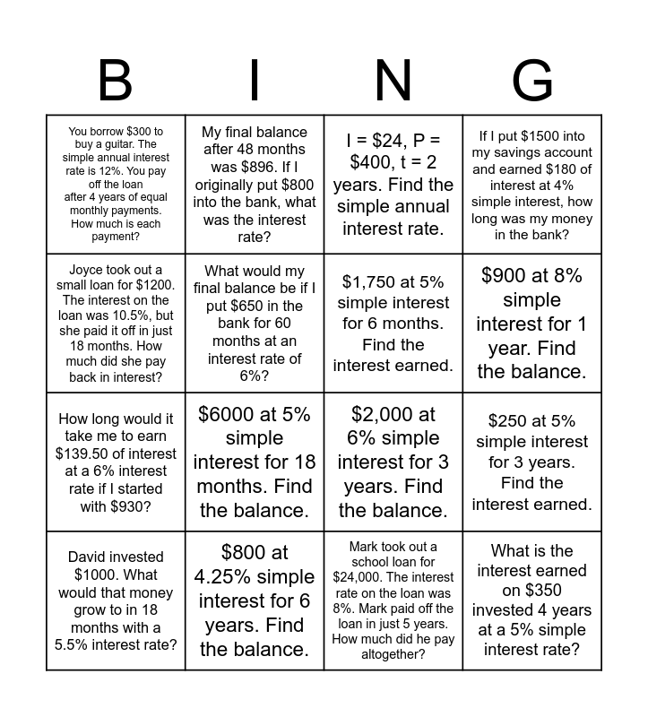 This bingo card has 16 words: $800 at 4.25% simple interest for 6 years. Find the balance., $250 at 5% simple interest for 3 years. Find the interest earned., I = $24, P = $400, t = 2 years. Find the simple annual interest rate., You borrow $300 to buy a guitar. The simple annual interest rate is 12%. You pay off the loan after 4 years of equal monthly payments. How much is each payment?, How long would it take me to earn $139.50 of interest at a 6% interest rate if I started with $930?, My final balance after 48 months was $896. If I originally put $800 into the bank, what was the interest rate?, $2,000 at 6% simple interest for 3 years. Find the balance., Mark took out a school loan for $24,000. The interest rate on the loan was 8%. Mark paid off the loan in just 5 years. How much did he pay altogether?, Joyce took out a small loan for $1200. The interest on the loan was 10.5%, but she paid it off in just 18 months. How much did she pay back in interest?, What would my final balance be if I put $650 in the bank for 60 months at an interest rate of 6%?, David invested $1000. What would that money grow to in 18 months with a 5.5% interest rate?, If I put $1500 into my savings account and earned $180 of interest at 4% simple interest, how long was my money in the bank?, $6000 at 5% simple interest for 18 months. Find the balance., $900 at 8% simple interest for 1 year. Find the balance., $1,750 at 5% simple interest for 6 months. Find the interest earned. and What is the interest earned on $350 invested 4 years at a 5% simple interest rate?.