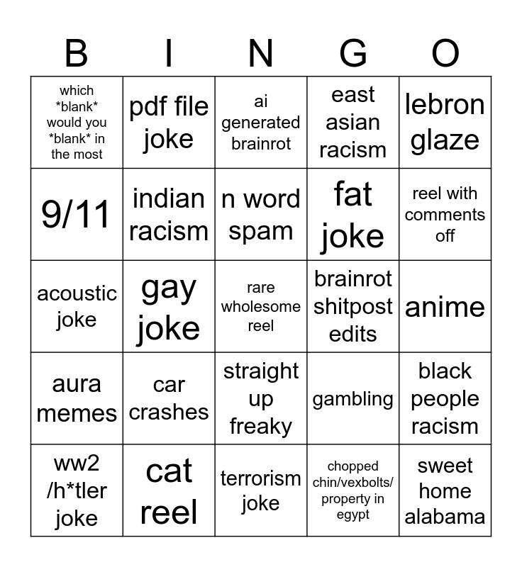 This bingo card has a free space and 24 words: car crashes, cat reel, n word spam, ww2 /h*tler joke, lebron glaze, which *blank* would you *blank* in the most, 9/11, pdf file joke, brainrot shitpost edits, straight up freaky, fat joke, acoustic joke, gambling, black people racism, indian racism, chopped chin/vexbolts/ property in egypt, anime, ai generated brainrot, reel with comments off, gay joke, sweet home alabama, aura memes, east asian racism and terrorism joke.