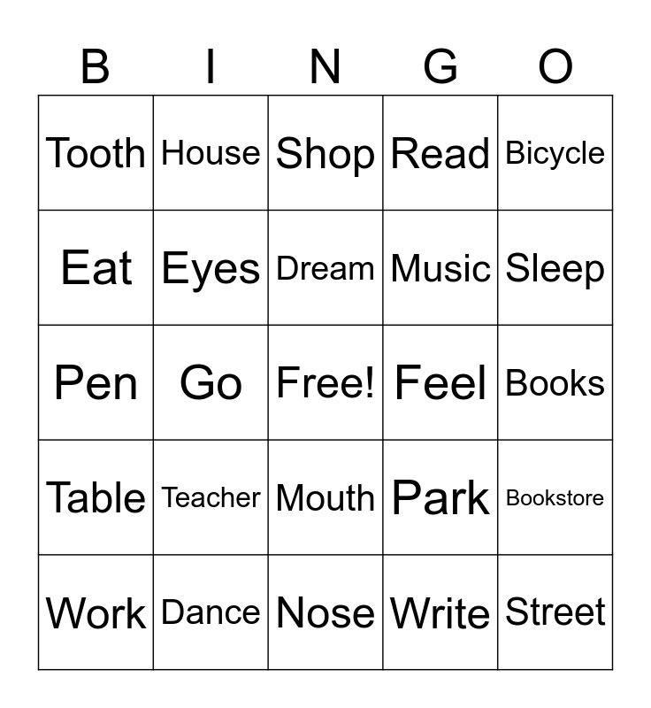 This bingo card has a free space and 50 words: Airplane, Street, Laugh, Nose, Teacher, Friend, House, Hear, Eat, Hands, Eyes, Read, Bookstore, Park, Library, Live, Dream, Feel, Learn, Bicycle, Go, Write, Tooth, Music, Wall, Car, Sleep, Market, Shop, Mouth, Draw, Dog, Sing, Body, Dance, Play, Cat, Chair, Feet, Books, Drink, School, Ear, Watch, Work, Pen, Paper, Smell, Table and Window.