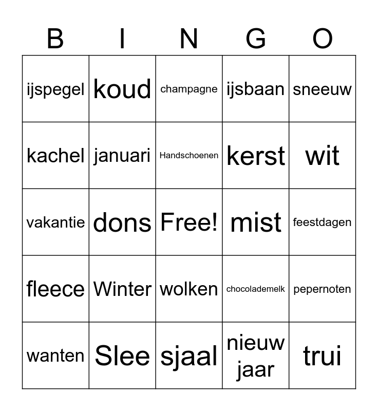 This bingo card has a free space and 24 words: Winter, Slee, Handschoenen, wanten, sneeuw, ijspegel, kachel, koud, mist, wolken, kerst, vakantie, chocolademelk, pepernoten, januari, nieuw jaar, feestdagen, champagne, wit, dons, trui, fleece, ijsbaan and sjaal.