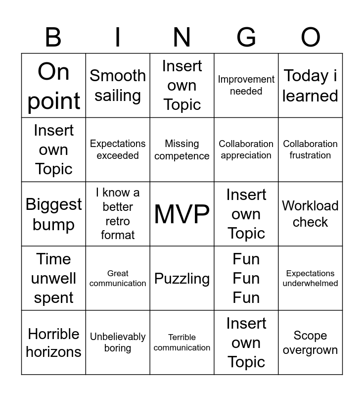 This bingo card has a free space and 24 words: Great communication, Unbelievably boring, Missing competence, Horrible horizons, Today i learned, On point, Insert own Topic, Smooth sailing, Insert own Topic, Puzzling, Collaboration appreciation, Biggest bump, Fun Fun Fun, Expectations underwhelmed, Expectations exceeded, Insert own Topic, Workload check, Insert own Topic, Collaboration frustration, I know a better retro format, Scope overgrown, Time unwell spent, Improvement needed and Terrible communication.
