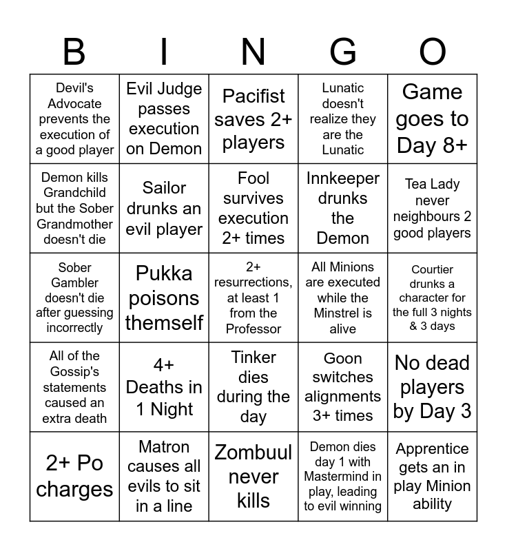 This bingo card has 25 words: 4+ Deaths in 1 Night, Zombuul never kills, Fool survives execution 2+ times, 2+ Po charges, Game goes to Day 8+, Devil's Advocate prevents the execution of a good player, Demon kills Grandchild but the Sober Grandmother doesn't die, Evil Judge passes execution on Demon, All Minions are executed while the Minstrel is alive, Tinker dies during the day, Innkeeper drunks the Demon, Sober Gambler doesn't die after guessing incorrectly, Goon switches alignments 3+ times, No dead players by Day 3, Sailor drunks an evil player, Apprentice gets an in play Minion ability, Courtier drunks a character for the full 3 nights & 3 days, Pacifist saves 2+ players, Tea Lady never neighbours 2 good players, Pukka poisons themself, 2+ resurrections, at least 1 from the Professor, Matron causes all evils to sit in a line, All of the Gossip's statements caused an extra death, Lunatic doesn't realize they are the Lunatic and Demon dies day 1 with Mastermind in play, leading to evil winning.
