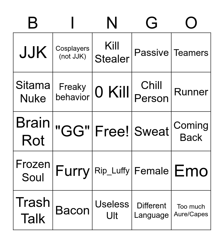 This bingo card has a free space and 24 words: Furry, Bacon, 0 Kill, Trash Talk, Teamers, JJK, Sitama Nuke, Cosplayers (not JJK), Sweat, Rip_Luffy, Chill Person, Brain Rot, Female, Emo, Freaky behavior, Different Language, Coming Back, Kill Stealer, Runner, "GG", Too much Aure/Capes, Frozen Soul, Passive and Useless Ult.