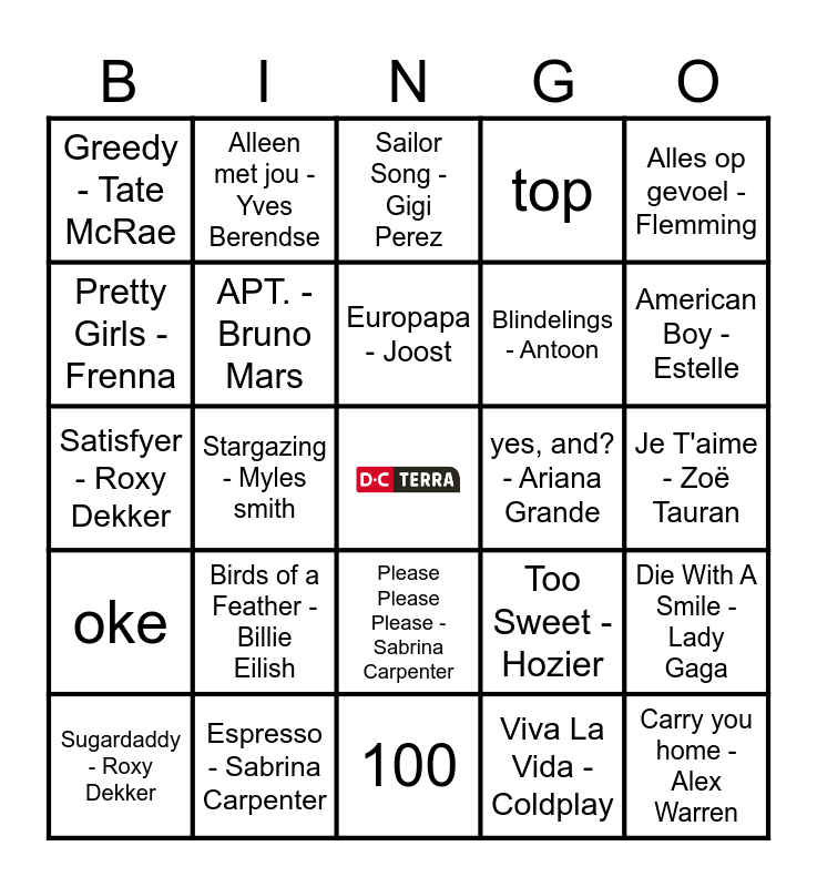 This bingo card has a free space and 24 words: Birds of a Feather - Billie Eilish, Espresso - Sabrina Carpenter, Europapa - Joost, Sugardaddy - Roxy Dekker, Alles op gevoel - Flemming, Greedy - Tate McRae, Pretty Girls - Frenna, Alleen met jou - Yves Berendse, yes, and? - Ariana Grande, Please Please Please - Sabrina Carpenter, Blindelings - Antoon, Satisfyer - Roxy Dekker, Too Sweet - Hozier, Die With A Smile - Lady Gaga, APT. - Bruno Mars, Viva La Vida - Coldplay, Je T'aime - Zoë Tauran, Sailor Song - Gigi Perez, American Boy - Estelle, Stargazing - Myles smith, Carry you home - Alex Warren, oke, top and 100.
