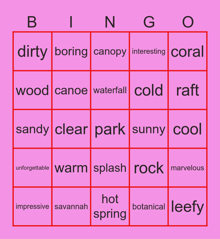 This bingo card has a free space and 29 words: wave, savannah, canopy, fresh, coral, dirty, canoe, waterfall, sunny, marvelous, impressive, clear, botanical, leefy, sandy, breeze, hot spring, rock, raft, unforgettable, warm, fish, cold, cool, wood, boring, splash, interesting and boat.