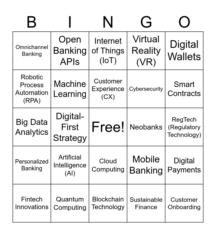 This bingo card has a free space and 25 words: Artificial Intelligence (AI), Blockchain Technology, Customer Experience (CX), Fintech Innovations, Digital Wallets, Omnichannel Banking, Robotic Process Automation (RPA), Open Banking APIs, Neobanks, Cloud Computing, Cybersecurity, Big Data Analytics, Mobile Banking, Digital Payments, Machine Learning, Innovation Labs, RegTech (Regulatory Technology), Internet of Things (IoT), Smart Contracts, Digital-First Strategy, Customer Onboarding, Quantum Computing, Personalized Banking, Virtual Reality (VR) and Sustainable Finance.