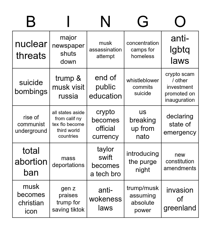 This bingo card has a free space and 24 words: mass deportations, gen z praises trump for saving tiktok, end of public education, musk becomes christian icon, anti-lgbtq laws, nuclear threats, suicide bombings, major newspaper shuts down, us breaking up from nato, taylor swift becomes a tech bro, whistleblower commits suicide, rise of communist underground, introducing the purge night, new constitution amendments, trump & musk visit russia, trump/musk assuming absolute power, declaring state of emergency, musk assassination attempt, crypto scam / other investment promoted on inauguration, all states aside from calif ny tex flo become third world countries, invasion of greenland, total abortion ban, concentration camps for homeless and anti-wokeness laws.