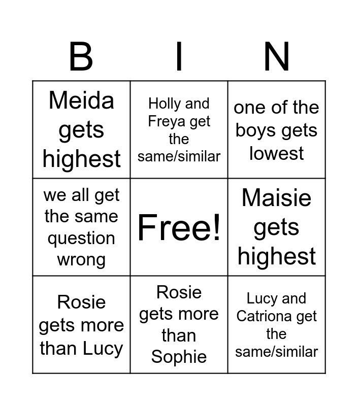 This bingo card has a free space and 8 words: Maisie gets highest, one of the boys gets lowest, Holly and Freya get the same/similar, Rosie gets more than Lucy, Meida gets highest, Lucy and Catriona get the same/similar, we all get the same question wrong and Rosie gets more than Sophie.