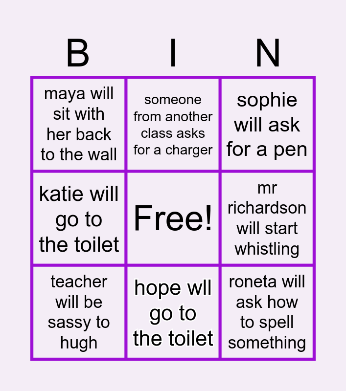 This bingo card has a free space and 8 words: mr richardson will start whistling, sophie will ask for a pen, someone from another class asks for a charger, teacher will be sassy to hugh, maya will sit with her back to the wall, roneta will ask how to spell something, katie will go to the toilet and hope wll go to the toilet.