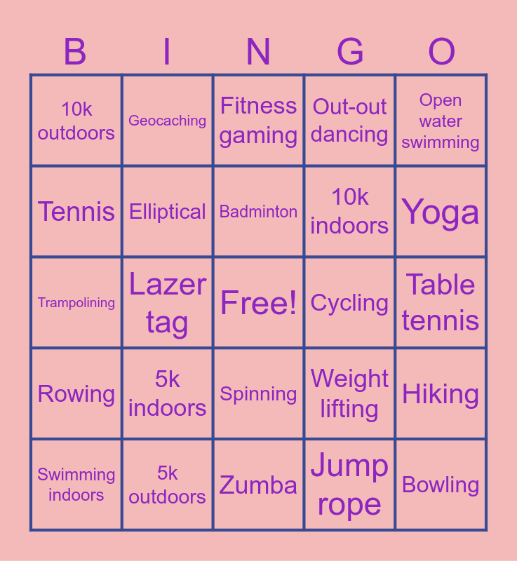 This bingo card has a free space and 24 words: 5k indoors, 5k outdoors, Badminton, Swimming indoors, Open water swimming, 10k outdoors, Tennis, Geocaching, Cycling, Spinning, 10k indoors, Trampolining, Weight lifting, Hiking, Elliptical, Jump rope, Table tennis, Fitness gaming, Yoga, Lazer tag, Bowling, Rowing, Out-out dancing and Zumba.