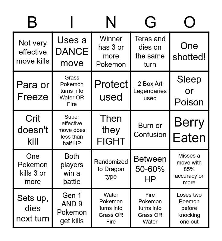 This bingo card has a free space and 24 words: Both players win a battle, Gen 1 AND 9 Pokemon get kills, Protect used, Sets up, dies next turn, One shotted!, Not very effective move kills, Para or Freeze, Uses a DANCE move, Burn or Confusion, Randomized to Dragon type, 2 Box Art Legendaries used, Crit doesn't kill, Between 50-60% HP, Misses a move with 85% accuracy or more, Grass Pokemon turns into Water OR FIre, Fire Pokemon turns into Grass OR Water, Berry Eaten, Winner has 3 or more Pokemon, Sleep or Poison, Super effective move does less than half HP, Loses two Poemon before knocking one out, One Pokemon kills 3 or more, Teras and dies on the same turn and Water Pokemon turns into Grass OR Fire.